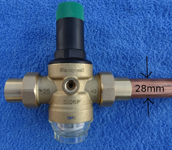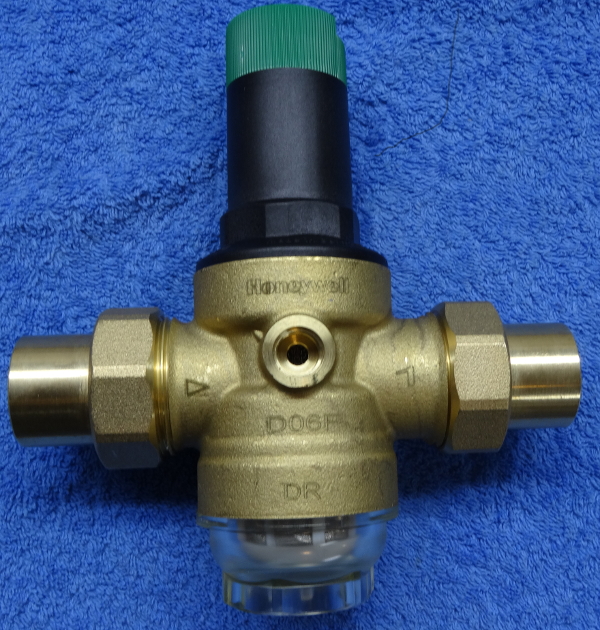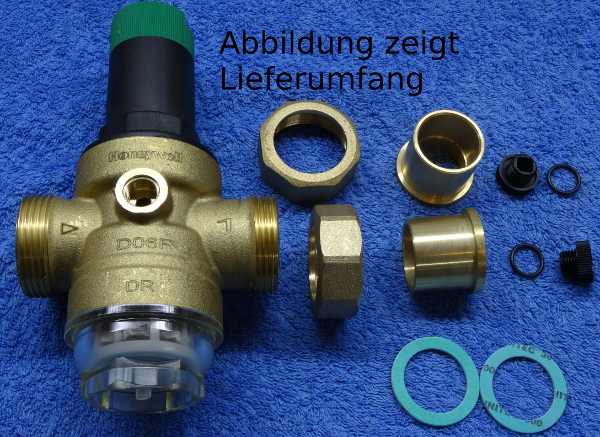 - Druckminderer D06F vom Hersteller Resideo (vormals Honeywell) mit Anschlussverschraubungen für ein 28mm Kupferrohr zum Löten