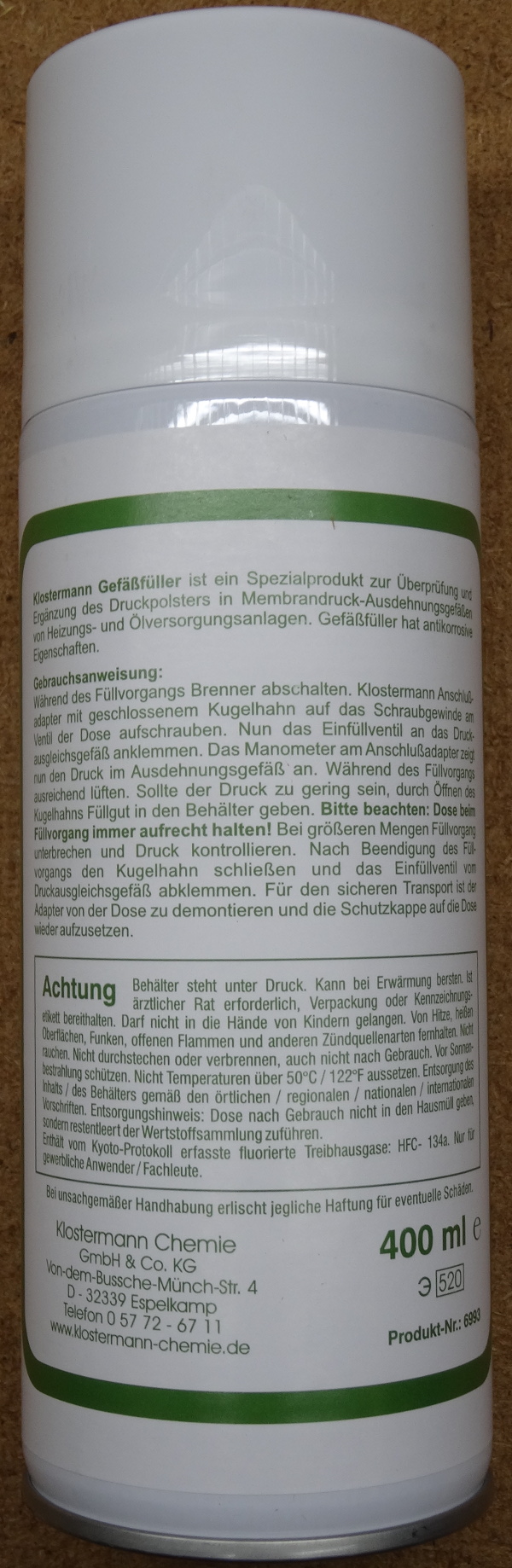 Das Produkt verfügt über ein Treibas, welches einen Dosendruck von ca. 5bar aufrecht erhält. Aus diesem Grunde sollten damit nur Ausdehnungsgefässe mit einem Enddruck von ca. 2bar aufgefüllt werden um ein stetes Strömen des Füllgases aus der Druckgasdose in das Ausdehnungsgefäss sicherzustellen. Aus diesem Grunde eignet sich das Produkt nicht für Ausdehnungsgefäss in Trinkwasser- und Solarkreisläufen, wo meist mit einem höherem Vordruck als 2bar gearbeitet wird.