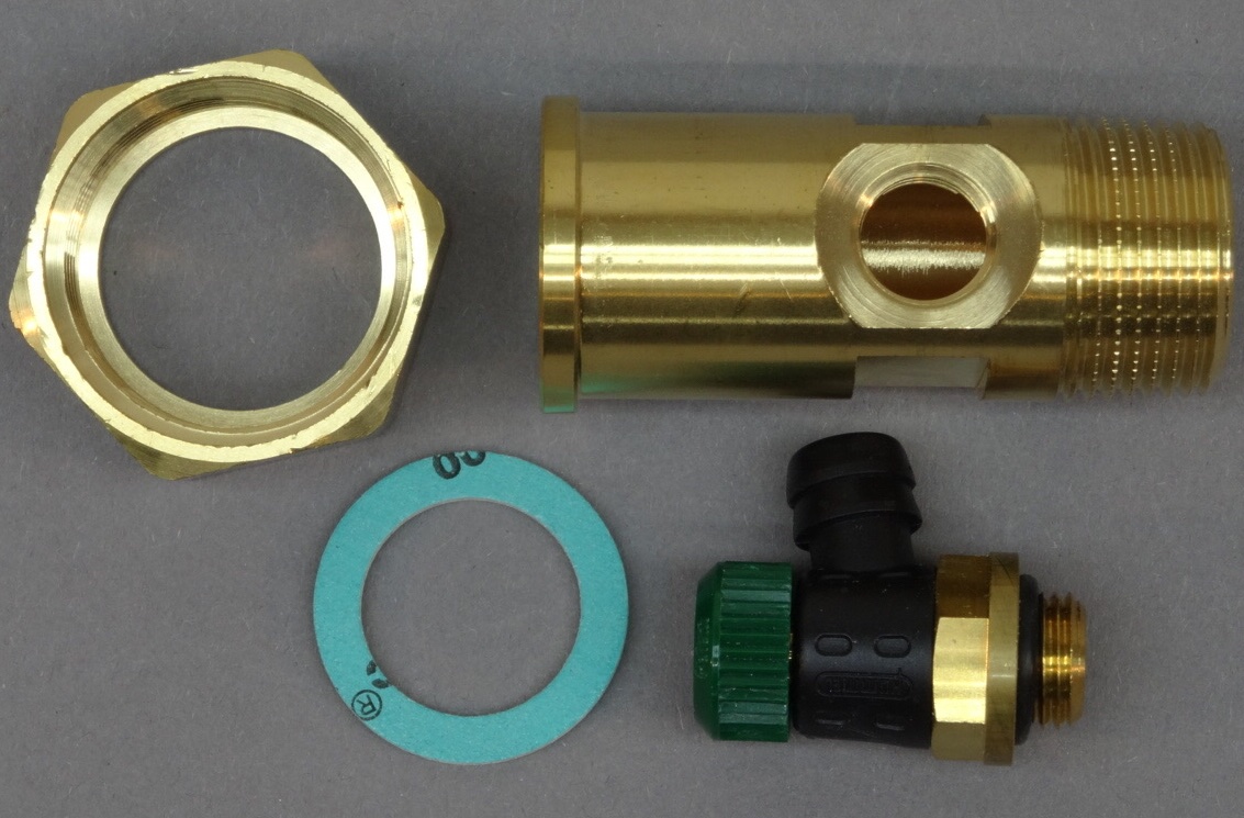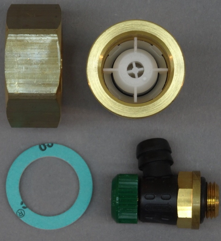 Set besteht aus: Rückflussverhinderer mit Überwurfmutter, Prüfhahn und einem Dichtring