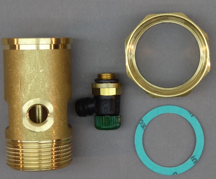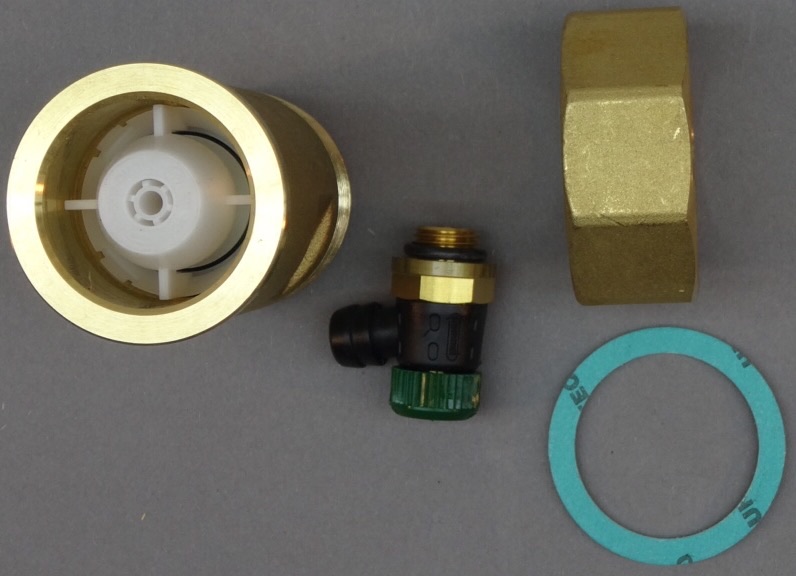 Set besteht aus: Rückflussverhinderer mit Überwurfmutter, Dichtring und Prüfhahn.