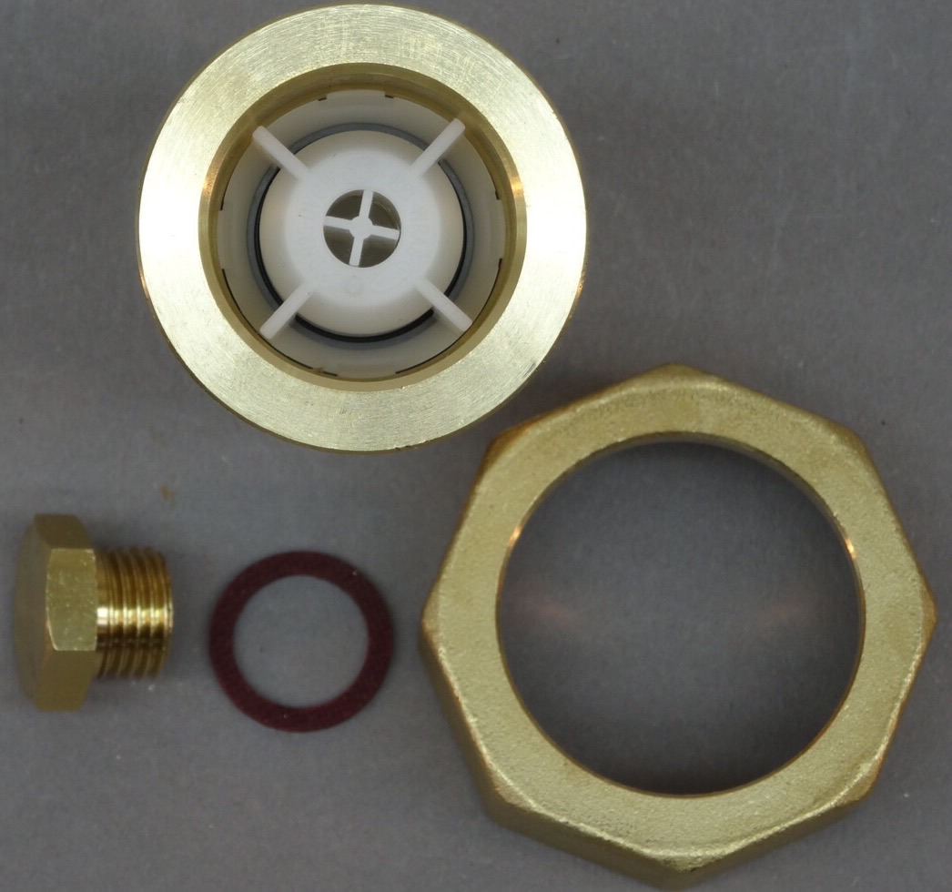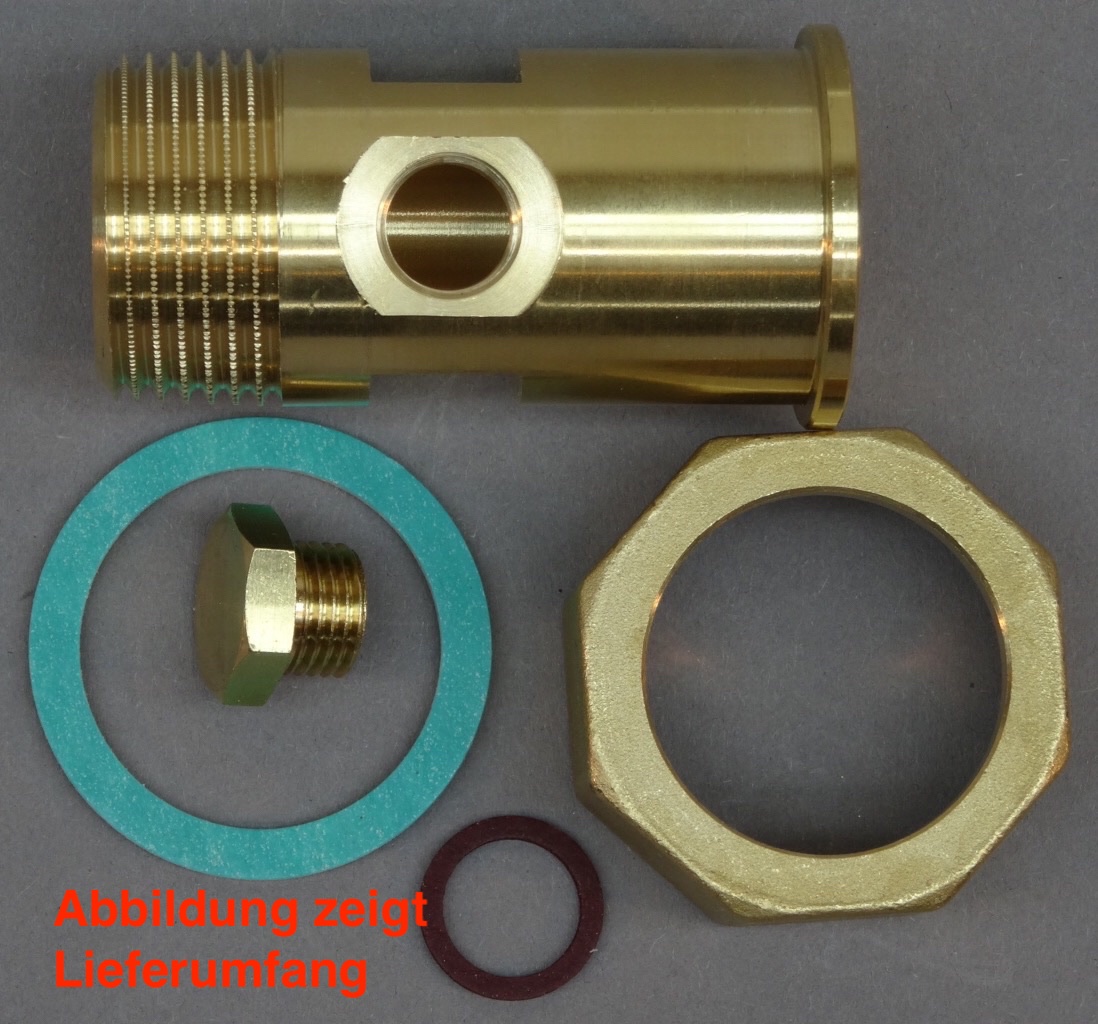 Set besteht aus: Rückflussverhinderer mit Überwurfmutter, Messingkappe und Dichtring.