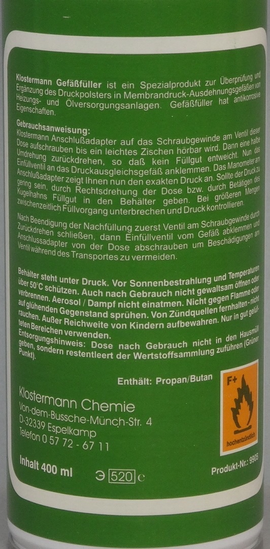 Das Produkt verfügt über ein Treibas, welches einen Dosendruck von ca. 5bar aufrecht erhält. Aus diesem Grunde sollten damit nur Ausdehnungsgefässe mit einem Enddruck von ca. 2bar aufgefüllt werden um ein stetes Strömen des Füllgases aus der Druckgasdose in das Ausdehnungsgefäss sicherzustellen. Daher eignet sich das Produkt nicht für Ausdehnungsgefäss in Trinkwasser- und Solarkreisläufen, wo meist mit einem höherem Vordruck als 2bar gearbeitet wird.