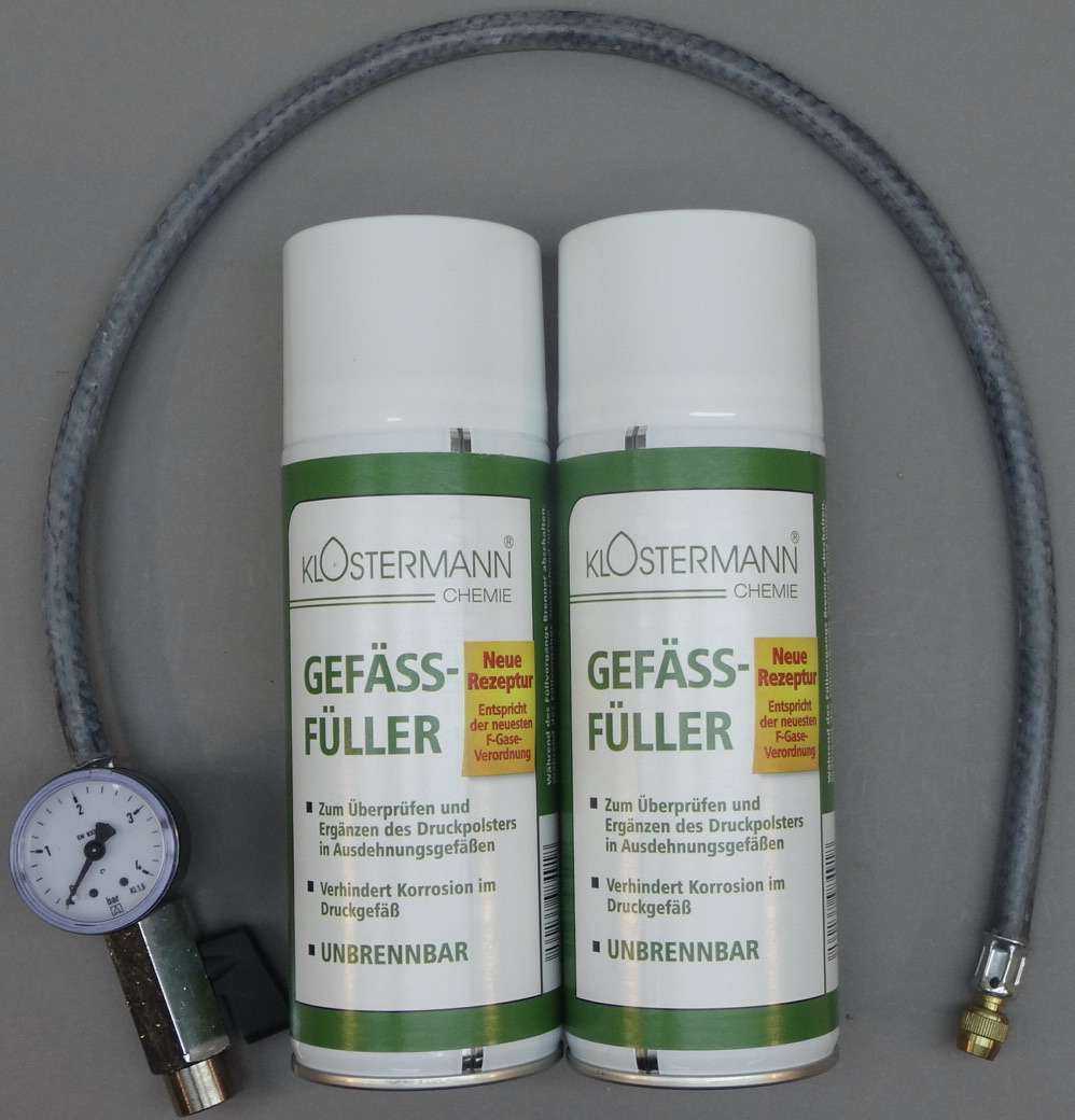 Das Produkt verfügt über ein Treibas, welches einen Dosendruck von ca. 5bar aufrecht erhält. Aus diesem Grunde sollten damit nur Ausdehnungsgefässe mit einem Enddruck von ca. 2bar aufgefüllt werden um ein stetes Strömen des Füllgases aus der Druckgasdose in das Ausdehnungsgefäss sicherzustellen. Daher eignet sich das Produkt nicht für Ausdehnungsgefäss in Trinkwasser- und Solarkreisläufen, wo meist mit einem höherem Vordruck als 2bar gearbeitet wird.