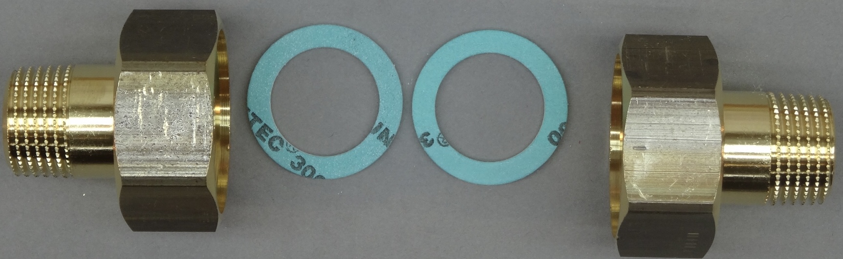 Die Verschraubung hier hat eine Überwurfmutter in 1" (IG) und zur Verrohrung hin 1/2" AG. Der Artikel hier besteht aus einem solchen Verschraubungspärchen (bestehend aus je 2 x Tülle, 2 x Überwurfmutter, 2 x Dichtring)